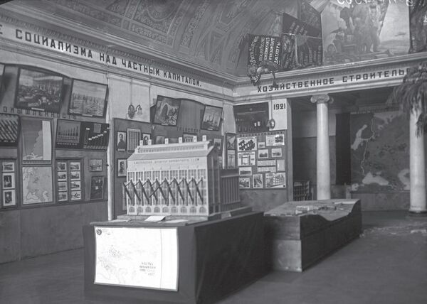 Первым развёрнутым документальным показом величия Октябрьской революции стала выставка «Красная Москва», открывшаяся в 1922 году в особняке бывшего Английского клуба на Тверской улице. На ней были представлены материалы, посвящённые Октябрьской революции 1917 года и деятельности московских советских организаций. В подготовке выставки, приуроченной к 5-летию революций, приняли участие Московский отдел народного образования, Моссовет и Московский комитет РКП(б) и Коллегия по делам музеев и охраны памятников искусства и старины Наркомпроса РСФСР. Собранный коллектив революционеров, историков, музейщиков с честью справился с поставленной задачей: на выставке достижения новой социалистической Москвы были представлены не только в документах, но и в многочисленных фотографиях, диаграммах, портретах и даже в «материальных документах сельскохозяйственной и фабричной жизни». Встречала посетителей деревянная скульптура авторства Сергея Конёнкова «Степан Разин с ватагою (со своею дружиною)» — группа из семи фигур из подсвеченного дерева (1919), что производило сильное впечатление на неискушённого гостя[3][4].