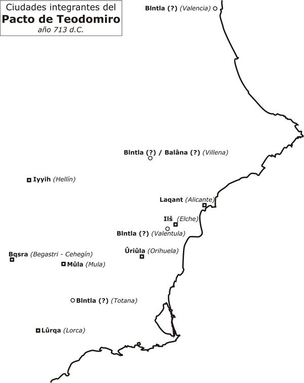 Из городов государства Теодемира часть имеют чёткую локализацию, местоположение других спорно. Это связано отчасти с тем, что три арабских автора по-разному передают их названия[3]: