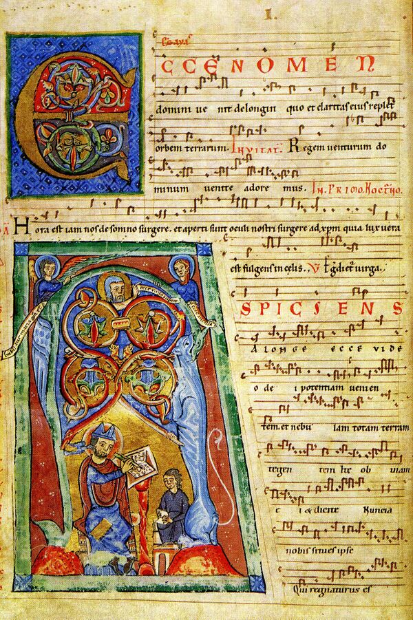Ранние примеры готической нотации — 77 распевов и литургическая драма «Ordo virtutum» Хильдегарды Бингенской, которые сохранились в двух рукописях XII в. — из Бельгии (Dendermonde. Abb. Benedict. 9, ок. 1163–1175) и Германии (Wiesbaden. Hessische Landesbibl. 2, ок. 1180–1190; из-за своих размеров последняя получила название Riesencodex, т.е. «гигантский кодекс»). В готической нотации зафиксирована музыка (в рукописи, составленной ок. 1300) Нейдхарта фон Ройенталя, а также других немецких миннезингеров.