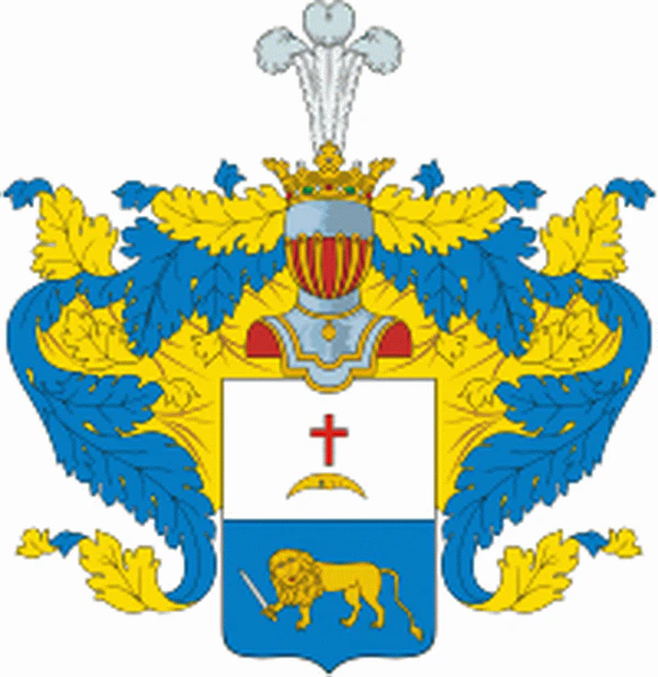 Описание герба: Выдержка из Общего гербовника Щит разделён горизонтально на две части, из коих в верхней в серебряном поле изображён красного цвета четырёхконечный крест и под ним луна, рогами вниз обращённая, а во второй части в голубом поле золотой лев, обращенный в правую сторону и держащий в правой лапе меч. Щит увенчан дворянским шлемом и короной с тремя страусовыми перьями. Намёт на щите голубой, подложен золотом. |