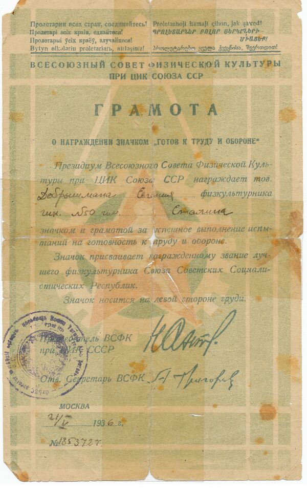 24 мая 1930 года газета «Комсомольская правда» предложила в целях стимулирования самодеятельной работы трудящихся Союза по физкультуре установить всесоюзные испытания на право получения специального значка «Готов к труду и обороне» и соответствующей грамоты ВСФК СССР[22].