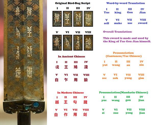 В 1965 году в провинции Хубэй были обнаружены более 50 захоронений царства Чу. Среди других находок был найден прямой меч, носящий надпись «Юэ-ван Гоуцзянь сделал этот меч для своего пользования» (кит. 越王勾踐,自作用劍).