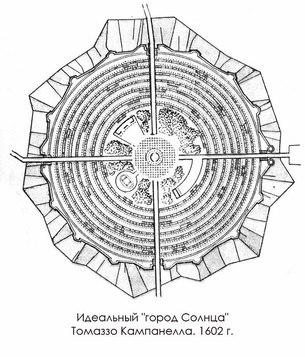 Социально-теологическая утопия, повлиявшая на дальнейшее развитие идеологии урбанизма, изложена в знаменитом сочинении Томмазо Кампанеллы «Город Солнца» (ок. 1602 г.).