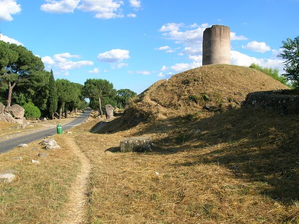 Другим типом захоронений был тумулус, также заимствованный римлянами у этрусков. Ранние тумулусы, как например, гробница Горациев на Аппиевой дороге или отдельные гробницы представителей рода Аврелиев там же, ещё были похожи на курганы, окружённые каменной крепидой. Они представляли собой земляные холмы с башенкой, но без погребальной камеры (урны с прахом усопшего помещались в основании сооружения)[41].