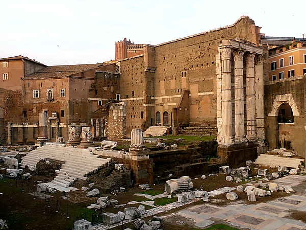 В комплекс форумов входили Римский форум, форум Цезаря, форум Августа, форум Веспасиана, форум Нервы и форум Траяна. На форумах или непосредственно возле них встречались главные магистрали Рима — Фламиниева дорога, Номентанская дорога, Тибуртинская дорога, Пренестинская дорога, Аппиева дорога, Остийская дорога и Портовая дорога[162]. Императорские форумы, связанные друг с другом проходами, образовали тесную группу изолированных ансамблей. Однако, они были мало связаны с окружающей городской застройкой (кроме проходного форума Нервы), фактически преграждая путь к Римскому форуму и Марсову полю[163].