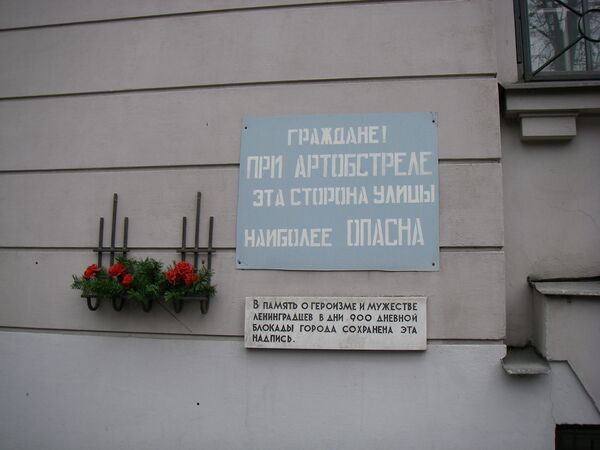 Гра́ждане! При артобстре́ле э́та сторона́ у́лицы наибо́лее опа́сна — надпись, наносившаяся в период блокады Ленинграда на стены многих зданий города с помощью трафарета.