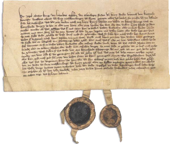 30 января 1384 года в Кёнигсберге Витовт заключил письменный договор с крестоносцами, по которому он становился вассалом Ордена как законный князь трокский и передавал ему Жемайтию до реки Невежис и Ковенскую область[30]. Витовту было обещано возвращение его княжеской вотчины.[10] В мае 1384 года крестоносцы начали строительство нового замка в Ковно, названного Новый Мариенвердер[31]. Этот замок также был передан под управление Витовта. Здесь 14 июля был подтверждён Кёнигсбергский договор, дополненный пунктом о наследстве дочери и братьев Витовта, а также о переходе его земель Ордену в случае отсутствия наследников[32].