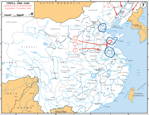 Осенью 1948 года развернулось Ляошэньское сражение в Маньчжурии, в результате которого была уничтожена полумиллионная группировка гоминьдановских войск. Соотношение сил резко изменилось в пользу коммунистов. В ноябре 1948 года вооружённые силы Коммунистической партии были реорганизованы в пять полевых армий (аналоги советских фронтов времён Великой Отечественной войны)[12]: