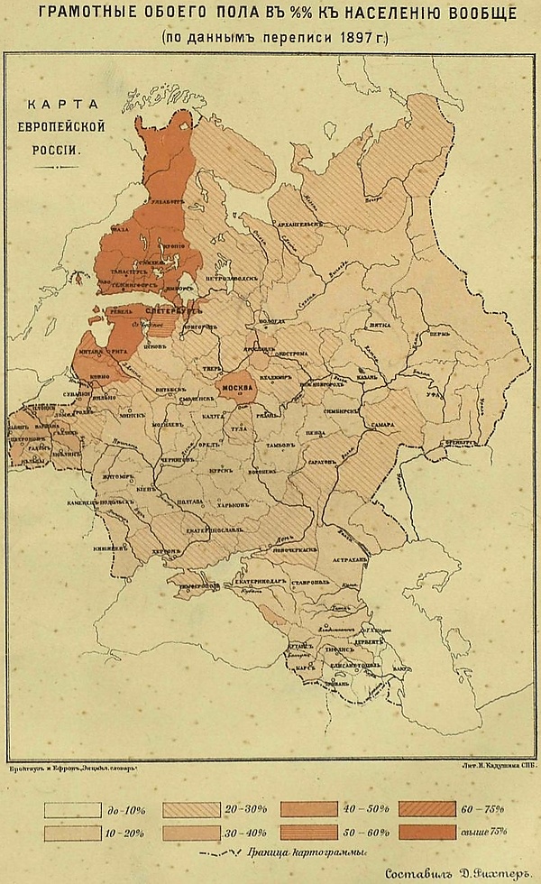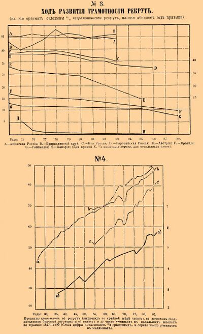 Ниже излагается содержание фрагментов статьи Энциклопедии Брокгауза и Ефрона «Грамотность»[1], которые построены целиком на отечественном материале, но расположены в различных частях оригинального текста. Бо́льшая часть таблиц озаглавлена вновь.