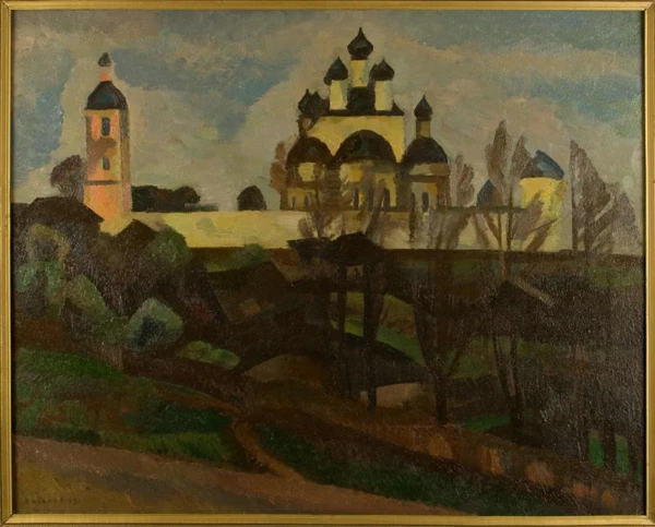 На картине изображён пейзаж. На первом плане видны фрагменты каменных домов, которые утопают в буйной растительности. За домами располагаются невысокие горы. Линия горизонта делит полотно на две части: на ней изображены горы голубого цвета, а выше — серо‑голубое небо со слоистыми облаками. Работа выполнена в эскизной манере. В колорите преобладают голубые, серо‑малиновые и тёмно‑зелёные тона.