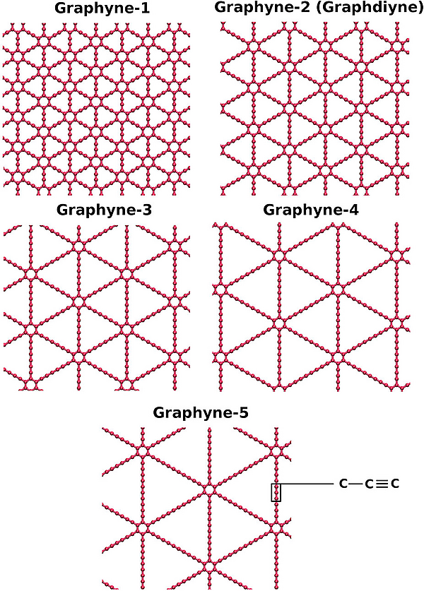 Вследствие наличия sp-гибридизованных связей графин по своей структуре и свойствам значительно отличается от других аллотропных модификаций углерода[6]. Возможны три структуры графина: α-графин, где все три связи sp2-гибридизированных атомов с соседними атомами заменяются на карбиновые цепочки (с тройными связями), β-графин, где заменяются две связи, и γ-графин, где заменяется только одна связь[1][7][8]. Графдиин является наиболее стабильной из не встречающихся в природе аллотропных модификаций углерода, содержащих диацетиленовые связи[9].