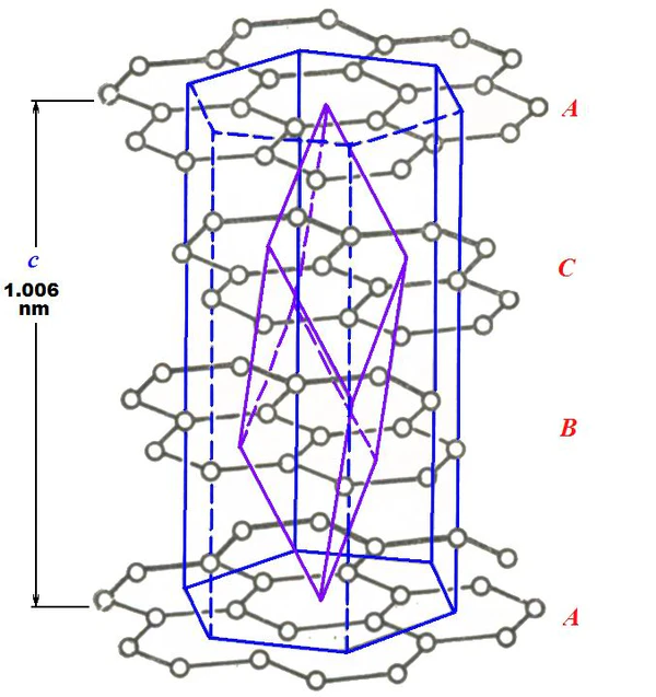 Различают две модификации графита: α-графит (гексагональный P63/mmc) и β-графит (ромбоэдрический R(-3)m). Различаются упаковкой слоёв. У α-графита половина атомов каждого слоя располагается над и под центрами шестиугольника (укладка …АВАВАВА…), а у β-графита каждый четвёртый слой повторяет первый. Ромбоэдрический графит удобно представлять в гексагональных осях, чтобы показать его слоистую структуру.