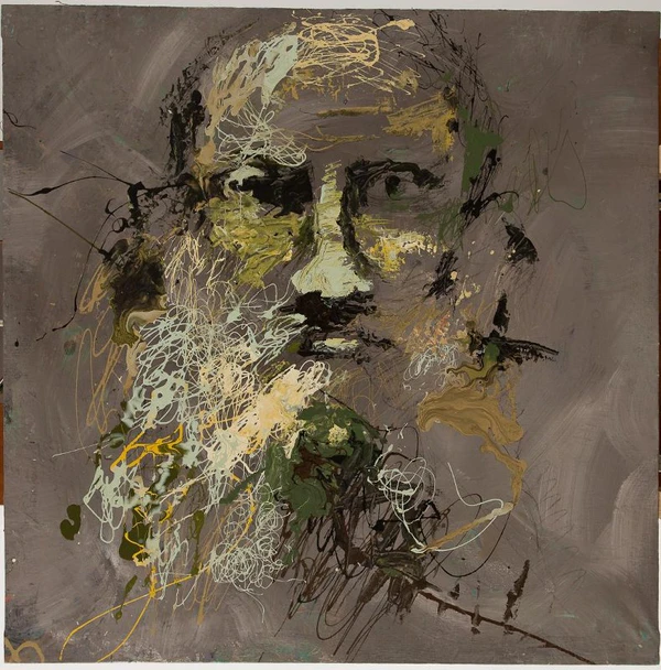 На картине изображён оплечный портрет графа Льва Толстого. Полотно выполнено в декоративном стиле. На плотном серо-коричневом фоне неровными зигзагообразными линиями, кляксами и мазками обозначены некоторые черты лица. Глаза, нос и губы выражены более отчётливо, остальные черты угадываются в целом силуэте, создаваемом красками.