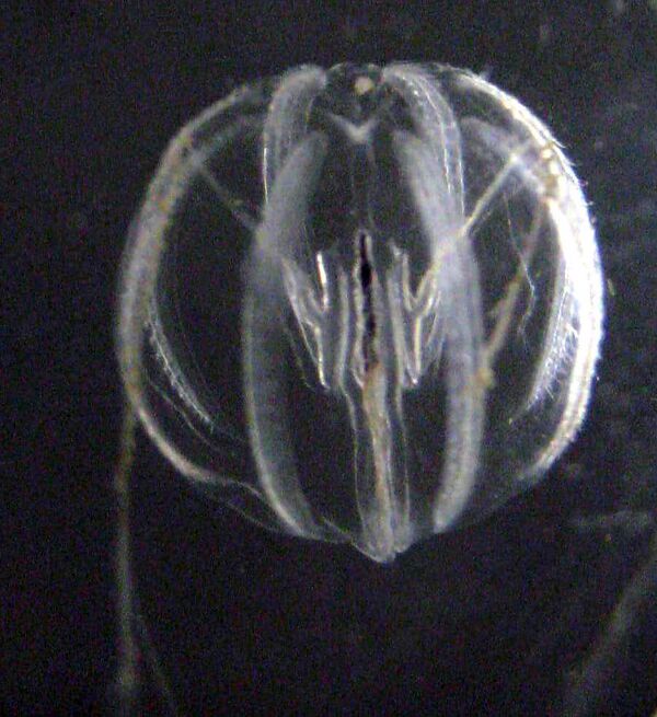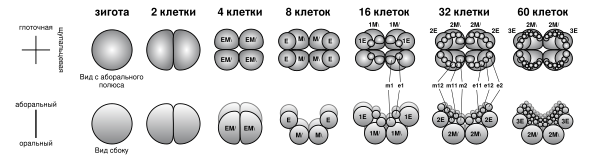 Яйца оплодотворяются в морской воде. В зиготах желток сконцентрирован в центре, а по периферии клетки находится цитоплазма с меньшим количеством желтка и ядро. Зигота претерпевает детерминированное дробление, то есть судьба каждого бластомера определяется ещё на самых ранних этапах дробления. Точка, в которой начинает формироваться первая борозда, соответствует оральному полюсу. Две первые взаимно перпендикулярные борозды дробления соответствуют будущим глоточной и щупальцевой плоскостям. Такое двулучевое дробление уникально для животного мира. В результате дальнейшего деления на оральном полюсе оказываются несколько макромеров, а на аборальном полюсе — многочисленные мелкие микромеры. Гаструляция идёт по типу эпиболии: аборальные микромеры перемещаются в сторону орального полюса, где погружаются в эмбрион путём инвагинации. Из них впоследствии развивается эпидермис, глотка, щупальцевые влагалища и гонады, то есть они имеют эктодермальное происхождение. Из макромеров отделяются микромеры орального полюса, которые представляют собой мезодерму. Они попадают в бластоцель через первичную кишку и дают начало миоцитам и другим клеткам мезодермы. После отделения оральных микромеров макромеры формируют энтодермальные каналы целентерона[35][33]. Главную роль в развитии и поддержании интерстициальных клеток играют гены семейства Sox[36].