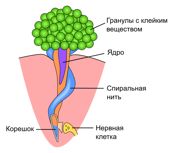 В эпидермисе тентилл и щупалец имеются многочисленные специализированные клетки — коллоциты, которые выделяют клейкое вещество и приклеиваются к добыче. Коллоциты, как и стрекающие клетки, формируются в эпидермисе в ходе дифференцировки интерстициальных клеток. Зрелый коллоцит состоит из вздутой апикальной части (шапочки), которая несёт многочисленные везикулы с клейким веществом, и более узкой «ножки», которая заякоривает коллоцит в эпидермисе, мышечном слое или мезоглее. Вокруг «ножки» спирально обвивается специальная нить, по-видимому, гасящая механическую нагрузку на коллоцит. Вероятно, каждый коллоцит используется только один раз и после этого заменяется новым[9].