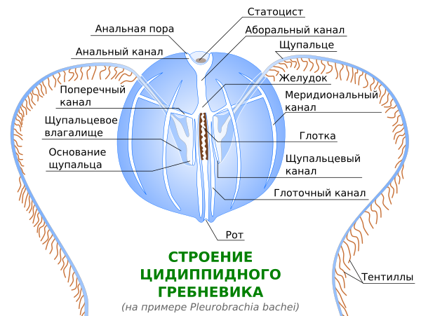 - Отряд Cydippida Gegenbaur, 1856 — планктонные сферические или овальные гребневики с хорошо развитыми щупальцами и щупальцевыми влагалищами. Между гребными пластинками нет ресничных бороздок[5].