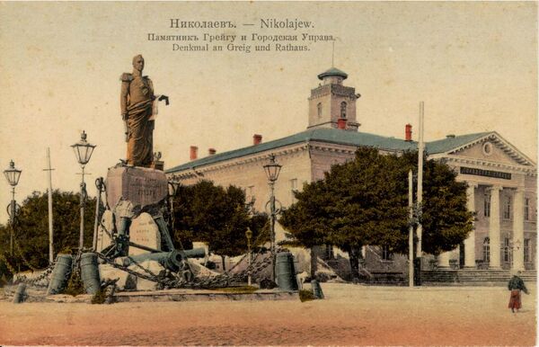 В 1883 году в Николаеве был поставлен памятник, выполненный по проекту М. О. Микешина известным скульптором А. М. Опекушиным. Скульптура была повёрнута в сторону реки Ингул, потому что в то время там находился главный въезд в город. В 1922 году советская власть демонтировала памятник, и дальнейшая его судьба неизвестна, по некоторым сведениям, он был пущен на переплавку. Однако есть данные, что ещё в 1925 году памятник находился на территории музея. Директор Феодосий Каминский пытался сохранить и саму скульптуру, и морские атрибуты, снятые с постамента. Постамент памятника был оставлен, позднее на него был установлен памятник В. И. Ленину. В 1957 году на месте этого памятника был установлен другой памятник Ленину, который был настолько крупнее первого, что потребовалось установка нового постамента, настолько массивного, что в качестве фундамента для него пришлось использовать гранитные постаменты с еврейского кладбища. Старый памятник вместе с постаментом был подарен и перенесён в город Первомайск. Впоследствии, уже в Первомайске, он был демонтирован, оставшийся постамент памятника Грейга также был демонтирован 24 февраля 2014 года.