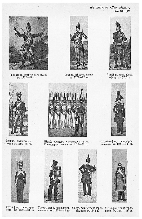 В России гренадеры появились с небольшим опозданием — в 1704 году, при Петре Великом. В каждом пехотном и кавалерийском полку была сформирована гренадерская рота, что соответствовало европейской практике. Через четыре года были сформированы отдельные гренадерские полки, которые после смерти Петра I расформировали. В 1765 году, при Екатерине II, они были восстановлены.