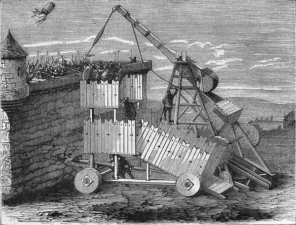 «Однажды вечером, когда мы несли ночной караул у башен, случилось, что они подвезли орудие, называемое камнеметом, которое они ещё не использовали, и заложили греческий огонь в пращу… Греческий огонь, когда его бросали, был размером с винный бочонок, а выходящий из него огненный хвост был длиною с копье. И при движении он производил столь сильный шум, что казалось, будто это небесная молния; он походил на летящего по воздуху дракона. А сияние он распространял такое, что в лагере было светло как днем из-за обилия огня, излучавшего сильный свет. В этот вечер они три раза метали в нас греческий огонь и четыре раза стреляли огненными стрелами в нас из арбалетов с воротом…»