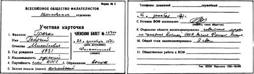 Учётная карточка Всесоюзного общества филателистов Г. М. Гречко
