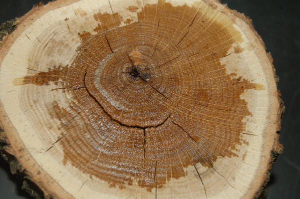 На торцах наблюдается в виде пятен разных размеров и очертаний: лунок, колец или концентрированной зоны. В срубленном дереве, как правило, дальнейшего развития этого порока не происходит. Встречается внутренняя темнина у всех пород как в ядре, так и в спелой древесине и в ложном ядре.