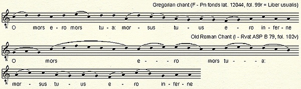 Так, сравнение григорианского и староримского распевов одного и того же молитвословного текста показывает пышную мелизматику региональной традиции по сравнению с более строгой невматикой григорианского мейнстрима (см. нотный пример). В области звуковысотности отличие региональных распевов от «стандартных» григорианских в том, что более древние региональные распевы не придерживаются системы восьми церковных тонов, утвердившейся в западной Европе во времена империи Каролингов[8]. В качестве одной из причин такого расхождения в гармонии учёные называют непосредственные контакты создателей региональных распевов с Византией[9]. Установление специфики ладового строения в региональных распевах затруднено в связи с тем, что документальных свидетельств для анализа недостаточно; кроме того, ряд имеющихся старинных нотных памятников (например, древнейших мозарабских) не поддаётся расшифровке.