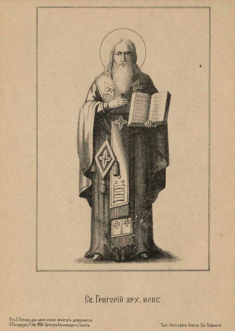 Григорий был современником преподобного Варлаама Хутынского. В 1192 году при освящении каменного храма в честь Преображения Господня в Хутынской обители архиепископ Григорий возвёл святого старца в сан игумена. В том же году была освящена и церковь апостолов Петра и Павла.