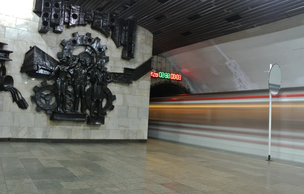 Потолок станции отделаны гофрированными металлическими листами, на нём располагаются два ряда люминесцентных ламп. Путевые стены отделаны светло-коричневым мрамором. На глухой торцевой стене располагается барельеф.