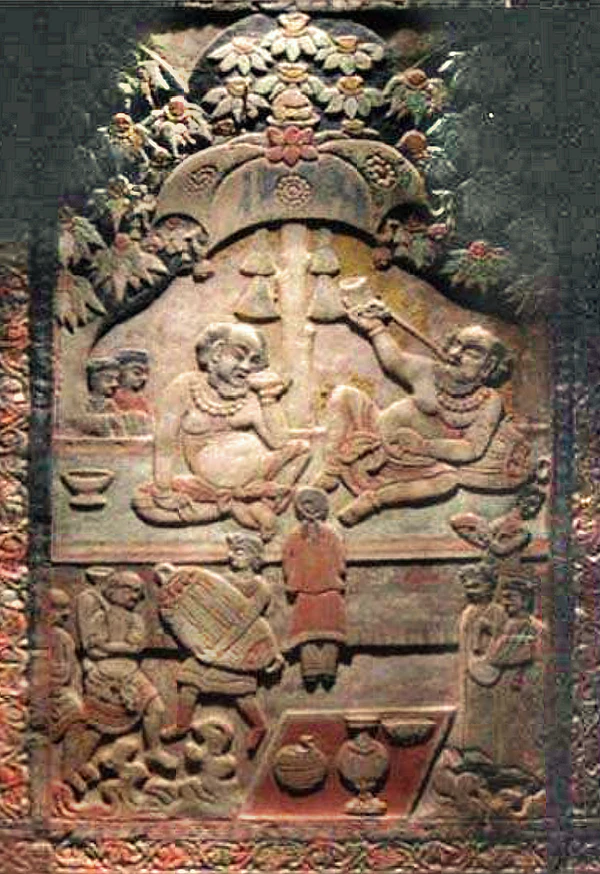 Гробница состояла из каменного ложа с декоративными панелями, — структура, типичная для гробниц, построенных в Китае в то время[3]. На панелях изображены процессия и караван некитайцев, сцена банкета с согдийской музыкой и танцами и сцена распития в саду[2]. На одной панели изображён умерший, ведущий караван, на другой — покойный, ведущий процессию мужчин в нимбе, возможная сцена загробной жизни. Многие носят псевдосасанидские короны[1]. На другой панели изображена сцена банкета с танцами и музыкой[1]. Последняя сцена панели, кажется, относится к загробной жизни, изображая вакханок, похожих на индийского Куберу, пьющих вино[1].