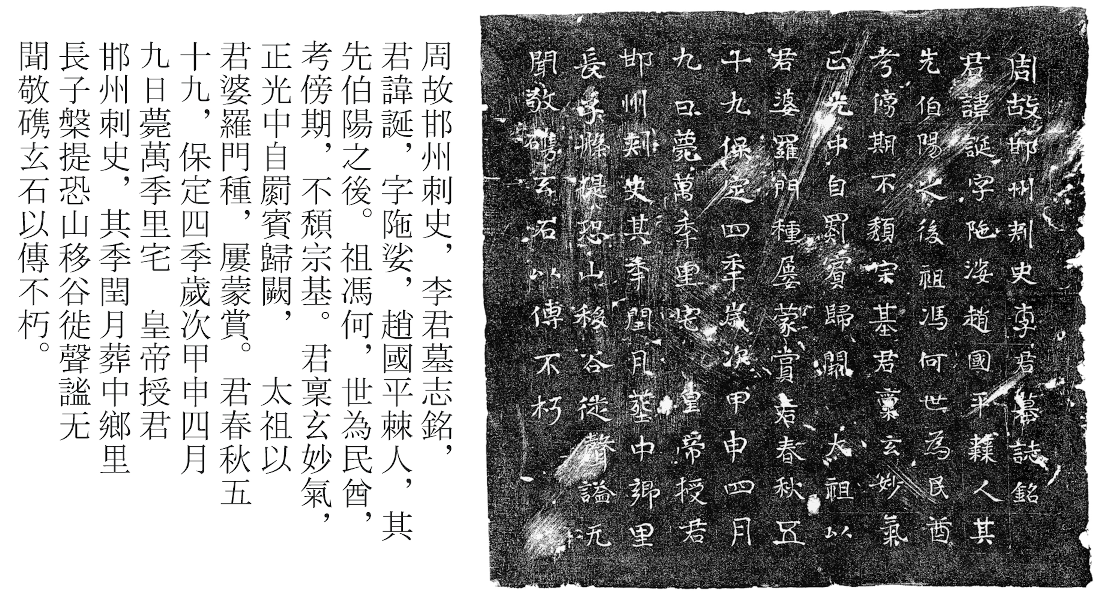 «Эпитафия Ли Даня, которого также звали Ли Туосуо, покойного префекта провинции Хань, который жил в Пинцзи, страна Чжао, потомка Бо Яна. Его дедом был Фэн Хэ, правитель племени, который много работал и поддерживал репутацию своего рода. Умерший был благородным человеком, который путешествовал из Цзибиня к императорскому двору во время эпохи Чжэнгуан (520–525 гг. н. э.). Поскольку он был брамином, император Тайцзун предложил ему множество подарков и наград. Покойный умер в возрасте 59 лет, 9 апреля, на 4-м году эпохи Баодин (564 г. н. э.), год Деревянной Обезьяны, в своём доме в Ванджили. Император дал ему титул «Префект провинции Хань», и он был похоронен в високосный месяц того же года в Чжонсянли. Его старший сын Панти, опасаясь катаклизмов и опасаясь, что имя его отца может быть забыто, благоговейно написал эту надпись на чёрном камне, чтобы его история могла быть передана незапятнанной».