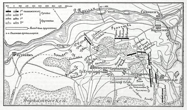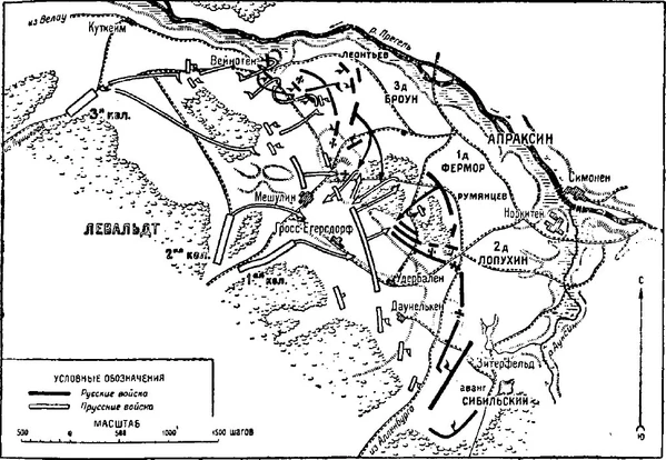 В ходе боевого столкновения 55-тысячная русская армия под командованием генерал-фельдмаршала С. Ф. Апраксина нанесла поражение 28-тысячному прусскому корпусу под командованием фельдмаршала Иоганна фон Левальда, который прикрывал дорогу на Кёнигсберг. Несмотря на достигнутый успех, Апраксин решил не преследовать неприятеля и после битвы приказал своим войскам отойти к Тильзиту[1][2].