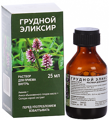 Содержит нашатырный спирт, масло семян аниса и экстракт солодки. Отхаркивающие действие эликсира складывается из действия его компонентов: