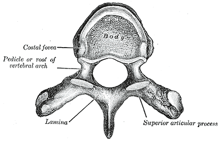 - Тело первого грудного позвонка, которое имеет сверху полную реберную ямку, сочленяющуюся с головкой первого ребра, и снизу полуямку, сочленяющуюся с головкой второго ребра;