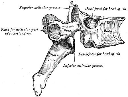 На задне-боковой поверхности тел находится две фасетки, верхняя реберная ямка (лат. fovea costalis superior) и нижняя реберная ямка (лат. fovea costalis inferior). Нижняя фасетка одного позвонка образует с верхней фасеткой нижележащего позвонка полную суставную ямку — место сочленения с головкой ребра.