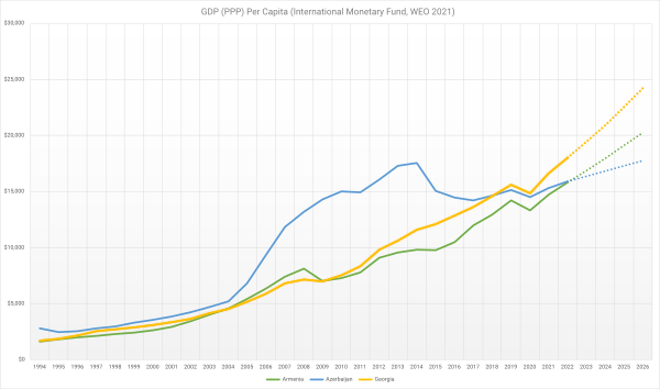 В 2012 году, по данным Всемирного банка, ВВП Грузии на душу населения (по паритету покупательной способности) составил $ 5902[106]. В 2007 году, по данным МВФ, темпы роста ВВП составили 12,4 %, в 2008 году — 2,4 %[107]. Внешнее финансирование сыграло значительную роль в обеспечении роста экономики в последние годы, а также в формировании государственной экономической политики и отраслевой структуры экономики[108][109][110]. В 2009 году, по данным ЦРУ, ВВП упал на 7 %[111]. Уровень безработицы в 2010 году составил 16,9 %[112]; доля населения, живущего за чертой бедности — 31 % (2006)[107]. По данным на II квартал 2011 года, совокупный внешний долг Грузии равнялся $ 10,5 млрд, что на $ 1,8 млрд превышало такой же показатель предыдущего года[113][114][115].