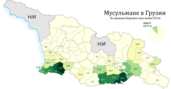 83,42 % населения Грузии исповедуют православие (Грузинская православная церковь), 10,74 % — мусульмане, 2,94 % — приверженцы Армянской апостольской церкви, 0,52 % — католики, 0,33 % — Свидетели Иеговы, 0,23 % — езиды, 0,07 % — протестанты, 0,04 % — иудеи; другие религии — 0,04 %[d]. Грузия является вторым после Армении государством в мире, принявшим христианство как государственную религию в IV веке. Грузинская Православная Церковь — одна из древнейших христианских церквей[102][103].