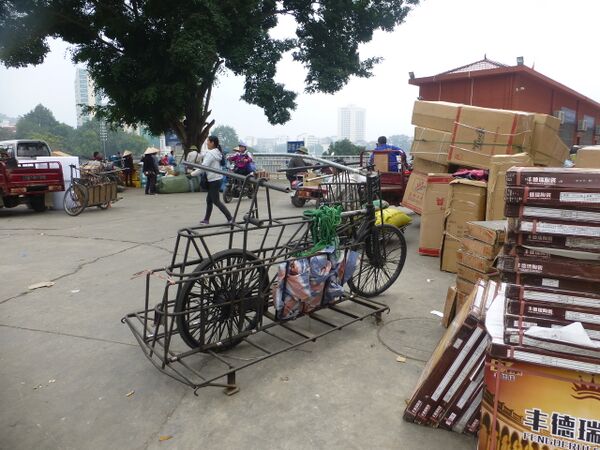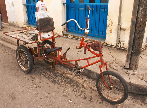 - Два колеса спереди, одно сзади; грузовая платформа находится перед водителем.