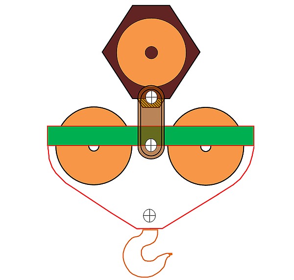 Они состоят из двух щёк — литых или из листового металла, между которыми на осях вращаются канатные блоки. В нижней части щёк траверсой закреплён грузовой крюк[3].