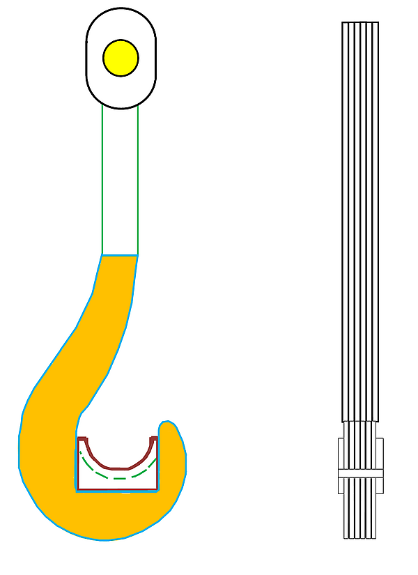 Крюки большой грузоподъёмности в основном выполнены пластинчатыми из отдельных элементов, вырезанных из листовой стали. Для более равномерной загрузки пластин в зеве крюка закрепляют вкладыши из мягкой стали, внешняя форма которых обеспечивает укладку строповых канатов с плавными перегибами[1].