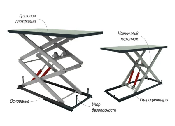 Подъемный стол состоит из ножничного подъемного механизма, который приводится в движение гидравлическим цилиндром. Давление в цилиндре нагнетается маслостанцией или силовым блоком. Обычно, грузовые подъемные столы устанавливаются в заранее подготовленном бетонном приямке. Но есть также разновидность низкопрофильного стола, который просто ставят на асфальт и подключают к сети.