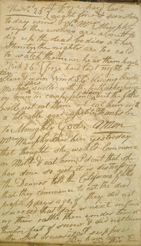 Более отвратительной и ужасной картины я никогда не видел. По приказу генерала Керни останки были собраны в кучу и сожжены. Они были похоронены в яме, которая была вырыта в центре одной из хижин в качестве "склада". Когда эти печальные мероприятия были проведены, хижины были сожжены, и каждая вещь в округе, связанная с этим ужасным событием, была уничтожена. Тело Джорджа Доннера было обнаружено в его лагере, примерно в 8 – 10 милях, завернутое в полотно. Оно было сожжено специально созданной группой мужчин.