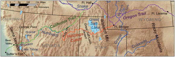 В 1842 г. в Калифорнию прибыл один из первых иммигрантов, Лэнсфорд Гастингс, который оценил перспективы этого региона. Чтобы привлечь переселенцев, он выпустил «Путеводитель по Орегону и Калифорнии для эмигрантов»[10]. В нём он описал прямой маршрут через Большой бассейн, который проходил через хребет Уосатч и пустыню Большого Соленого озера. При этом сам Гастингс не проходил по «своему» маршруту до начала 1846 г., когда он ехал из Калифорнии в Форт Бриджер. Форт на тот момент представлял собой небольшую перевалочную базу на реке Блэкс-Форк (штат Вайоминг), основанную Джимом Бриджером и его партнером Пьером Луисом Васкесом. Гастингс остался в форте и убеждал путешественников поворачивать на юг, на «свой» маршрут. По состоянию на 1846 г., Гастингс был вторым человеком, кому удалось пересечь южную часть пустыни Большого Соленого озера; при этом никто из них не пользовался обозом (пересечения пустыни индейцами документально не подтверждены, маршрут у эмигрантов не упоминался)[11].