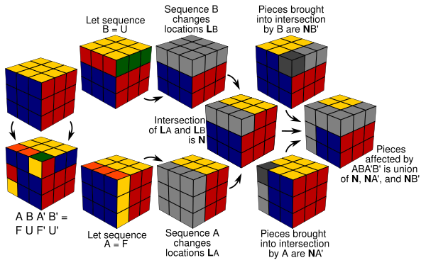 Тогда группа кубика Рубика определяется как подгруппа , порождаемая поворотами шести граней на 90°[2]: