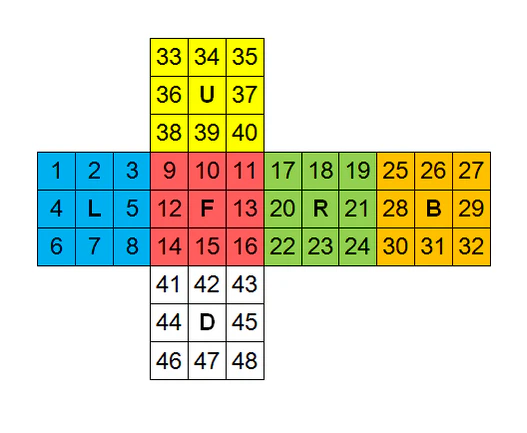 Каждый из поворотов граней кубика Рубика может рассматриваться как элемент симметрической группы множества 48 этикеток кубика Рубика, не являющихся центрами граней. Пометим центры граней буквами (см. рисунок), а остальные этикетки — числами от 1 до 48. Теперь поворотам соответствующих граней на 90° по часовой стрелке можно сопоставить элементы симметрической группы :