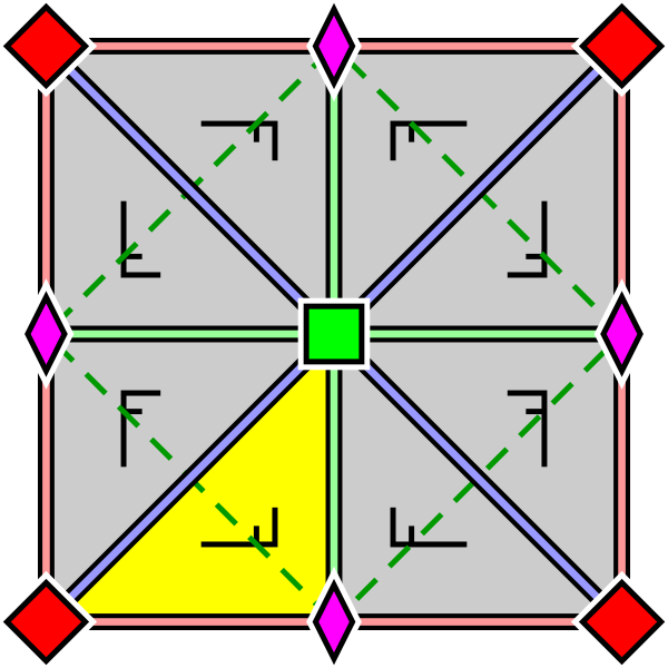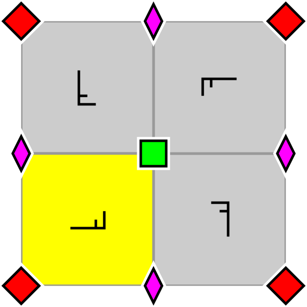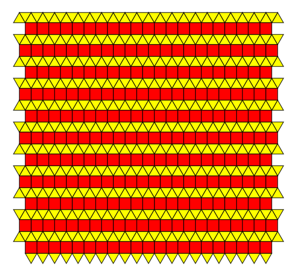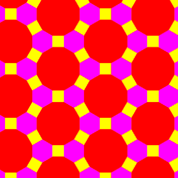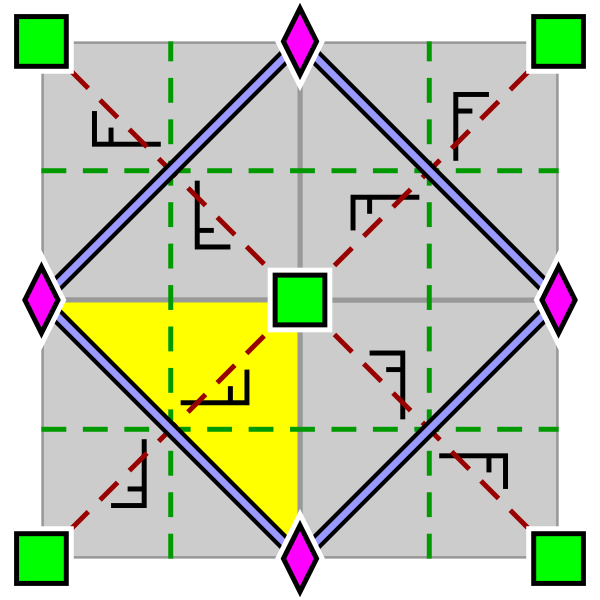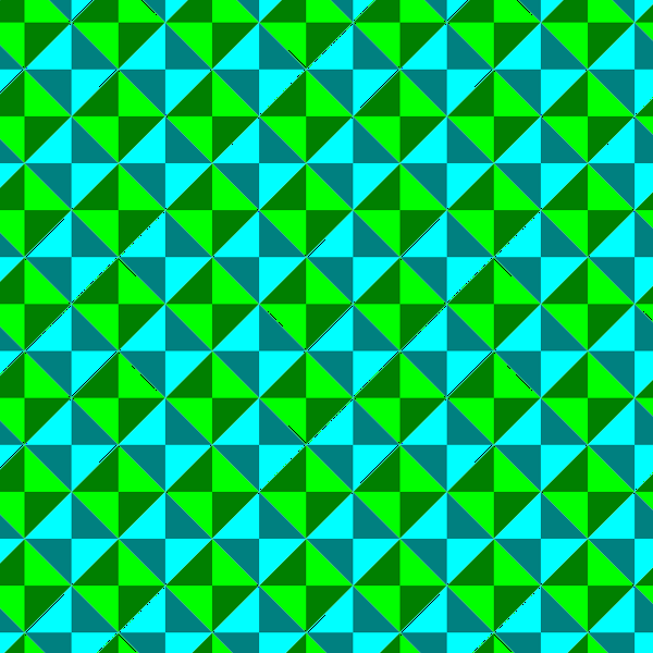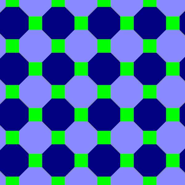 Это соответствует прямоугольной сетке строк и столбов одинаковых квадратов с четырьмя осями симметрии. Это также соответствует шахматному узору двух таких квадратов.
