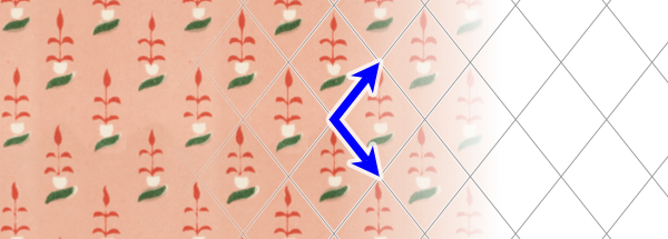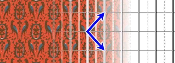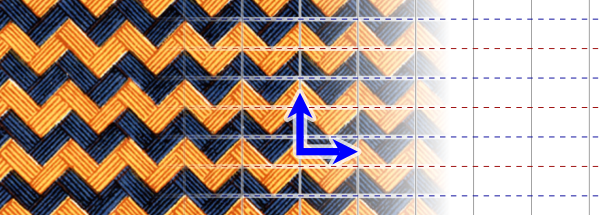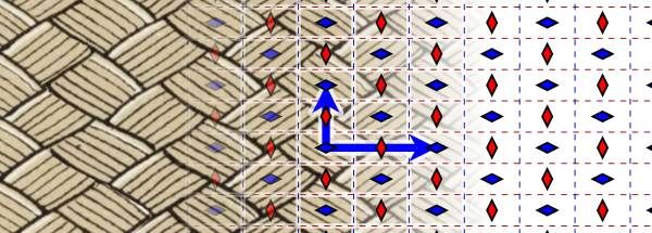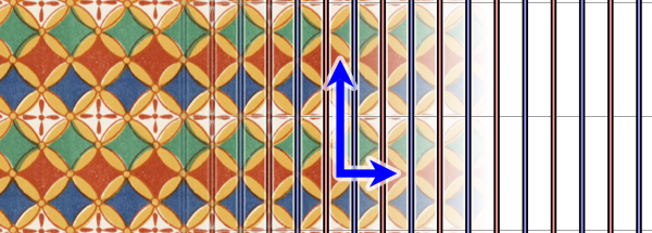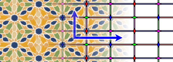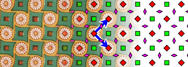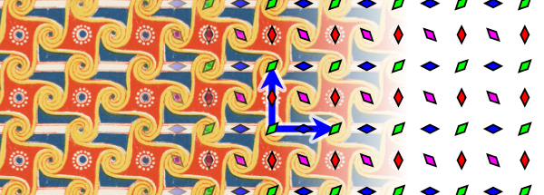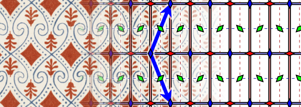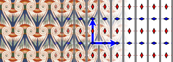 Однако пример C отличается. Он имеет отражения только относительно горизонтальных и вертикальных направлений, но не относительно диагональных осей. Если мы отразим узор относительно диагональной оси, мы не получим тот же самый узор. Мы получим исходный узор, смещённый на некоторое расстояние. Это одна из причин, почему группа орнаментов узоров A и B отличается от группы орнаментов узора C.
