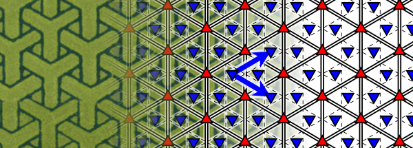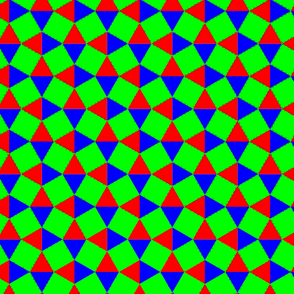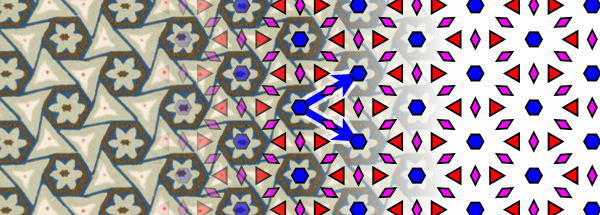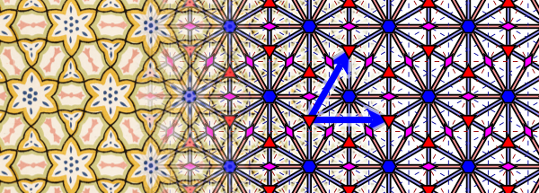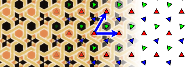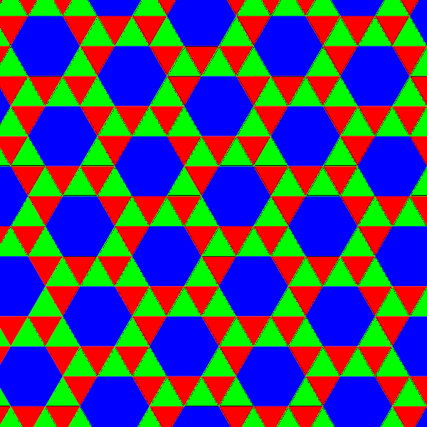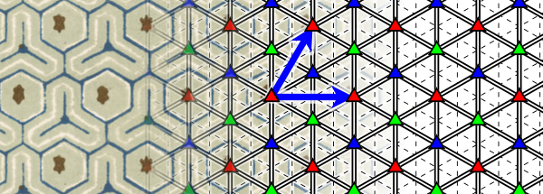 Представим мозаику плоскости с равносторонними треугольниками одного размера со стороной, соответствующей наименьшему параллельному переносу. Тогда половина треугольников имеют одну ориентацию, а другая половина симметрична. Группа орнаментов соответствует случаю, когда все треугольники одной ориентации равны, в то время как оба типа имеют вращательную симметрию порядка три, но эти два не равны, не являются зеркальными образами друг друга и оба не симметричны (если оба типа равны, мы имеем p6, если они являются зеркальными образами друг друга, мы имеем p31m, если оба типа симметричны, мы имеем p3m1, если два из этих трёх свойств имеют место, то имеет место и третье, и мы получаем p6m). Для заданного рисунка, возможны три из этих замощений, каждое с центрами вращения в вершинах, то есть для любого замощения возможны два сдвига. В терминах рисунка: вершины могут быть красные, синие или зелёные треугольники.