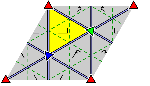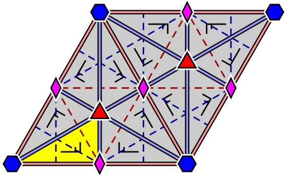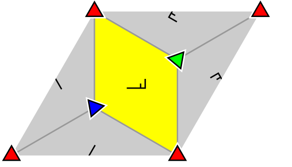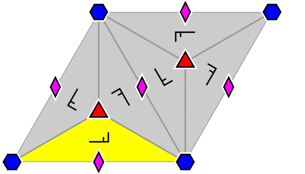 - В 5 случаях вращательной симметрии порядка 3 или 6, единичная ячейка состоит их двух равносторонних треугольников (шестиугольная решётка, сама по себе p6m). Они образуют ромбы с углами 60° и 120°.