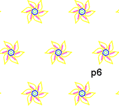 - Группа p6 имеет один центр вращения порядка шесть, которые отличаются только вращением на 60°. Она имеет также два центра вращения порядка три, которые отличаются только вращением на 120° и три порядка два (180°). Группа не имеет отражений или скользящих симметрий.