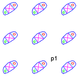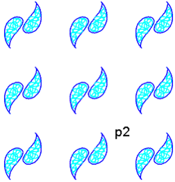 - p2 (p211): Примитивная ячейка, 2-кратная симметрия вращения, ни зеркальных отражений, ни скользящих симметрий.